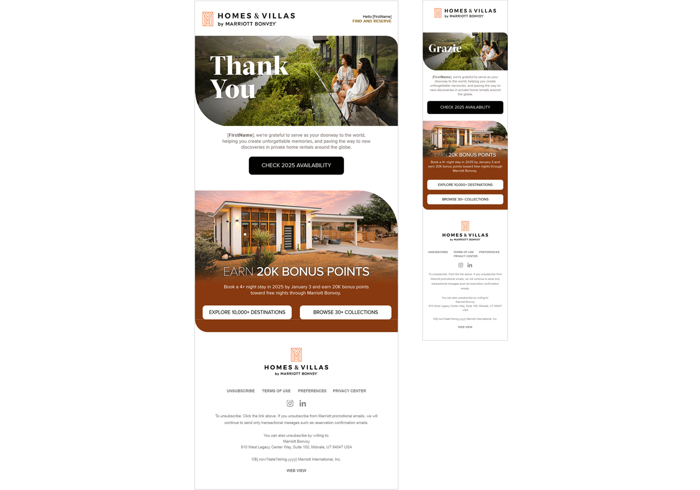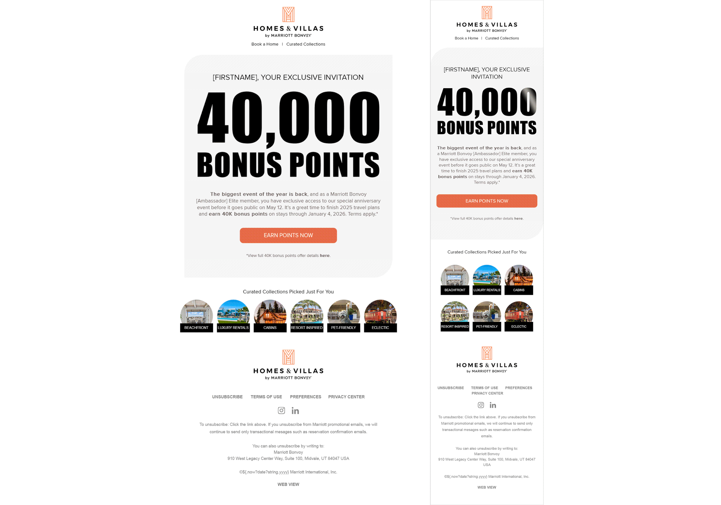 Marriott Homes & Villas is a retainer client leveraging our creative services and email design system. Using a mix of standard and custom modules, we deliver high-performing emails monthly—guided by click data, A/B testing, best practices, strategy, and brand style. HVMB sends 12–15 emails per month across segmented audiences in the US, Canada, EMEA, and APEC, along with ad hoc, transactional, pre-arrival, and new listing emails.
