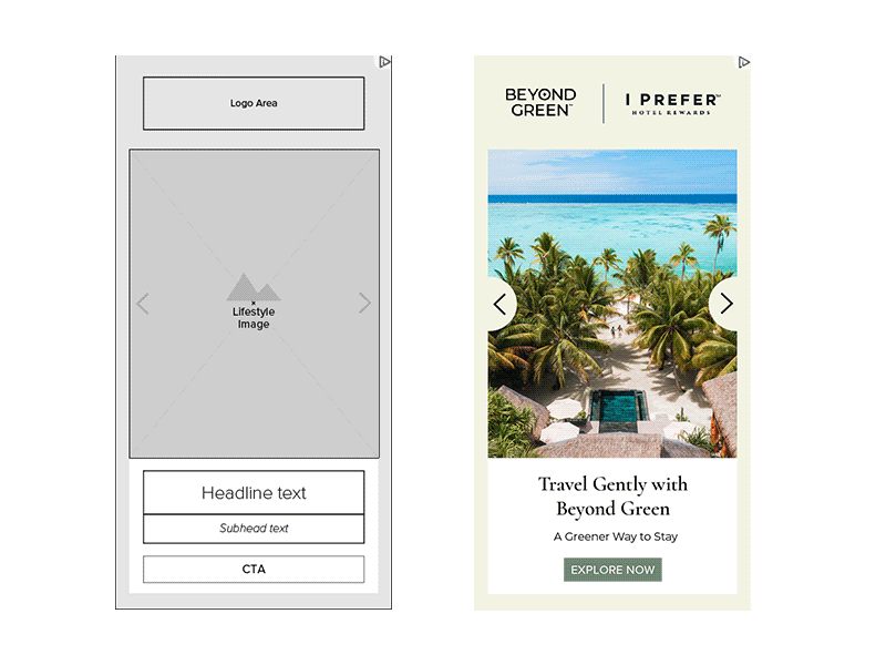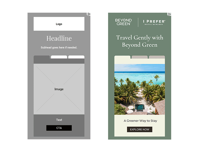 iPrefer was looking to launch a digital media Retention and Actions campaign aimed at deepening guest engagement and driving return visits. I developed a flexible wireframe system designed to support multiple brands under the iPrefer umbrella, allowing for seamless integration of various resort identities while maintaining consistent brand standards. The purpose was to showcase a diverse collection of resorts in a visually cohesive way, balancing individuality with a unified brand presence. The result was a polished, scalable design solution that elevated the campaign’s storytelling and enhanced the overall digital experience.